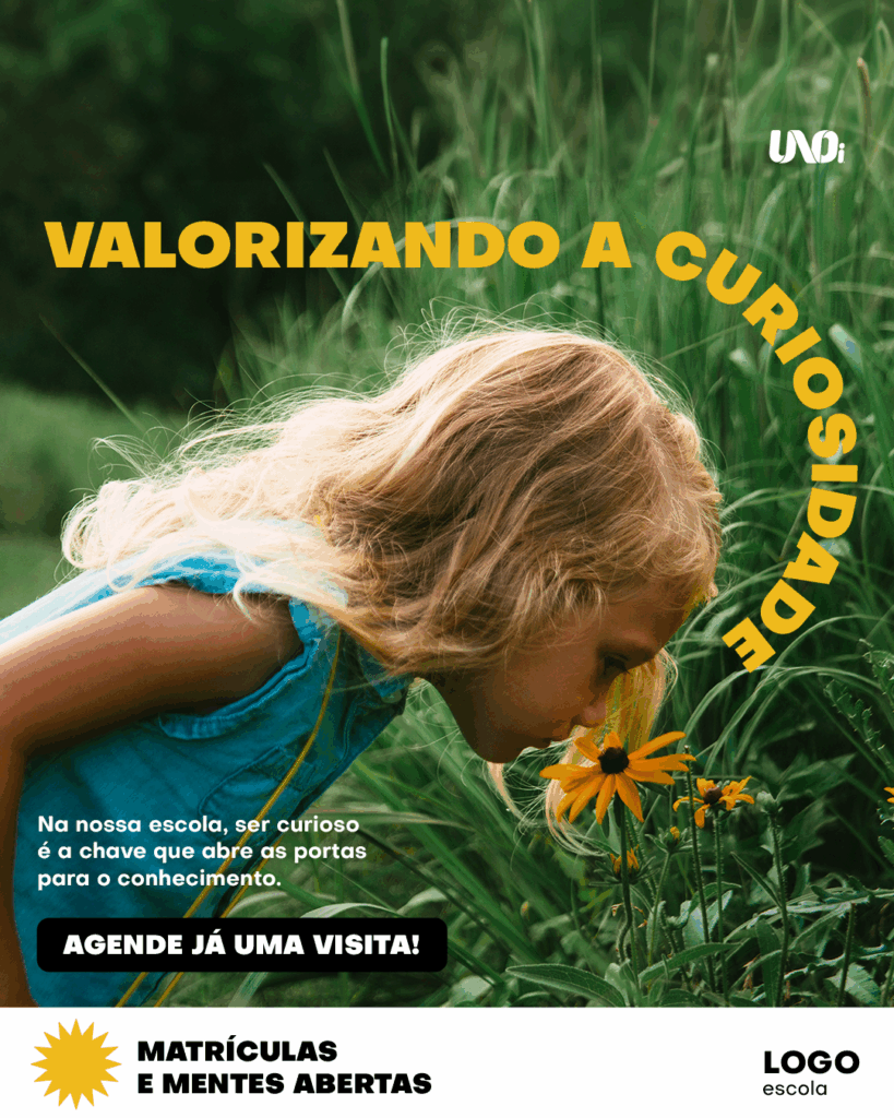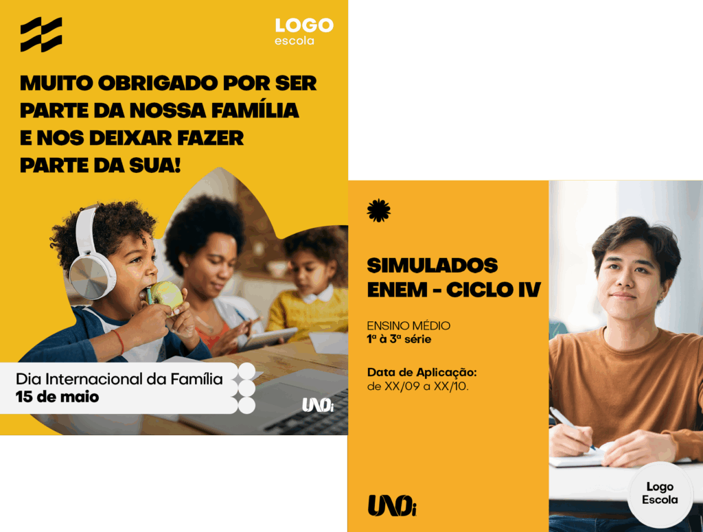 Além das campanhas do UNOi, há centenas de outros modelos para personalizar e publicar nas redes sociais ou em outro canal de sua preferência. Com a Plataforma de Criação de Marketing, é possível ajustar as campanhas de acordo com as necessidades de cada escola.